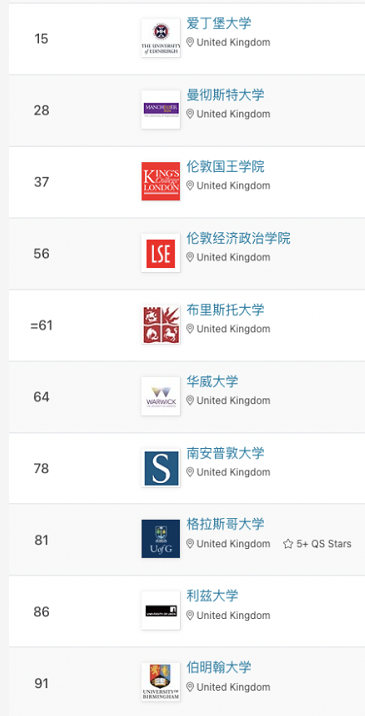 LSE伦敦政经排在了第56位,排在它之前的有深受中国留学生喜爱的爱丁堡大学(第15)、曼大(第28位)、以及伦敦国王学院(第37位)。