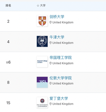 共有5所英国大学(牛津、剑桥、帝国理工、UCL、爱丁堡)位列全球前20名,且多数大学的排名强劲上升!