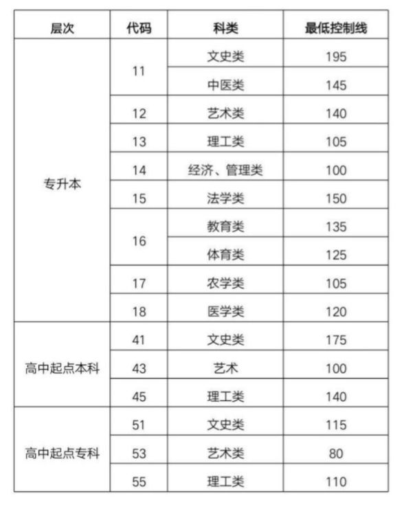 2018年成人高等教育考试招生网上录取最低控制分线数