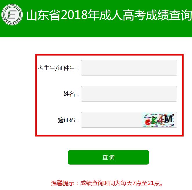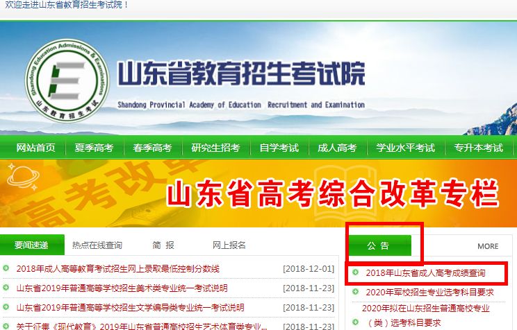 点击下方图中的红色框内的“2018年山东省成人高考成绩查询”