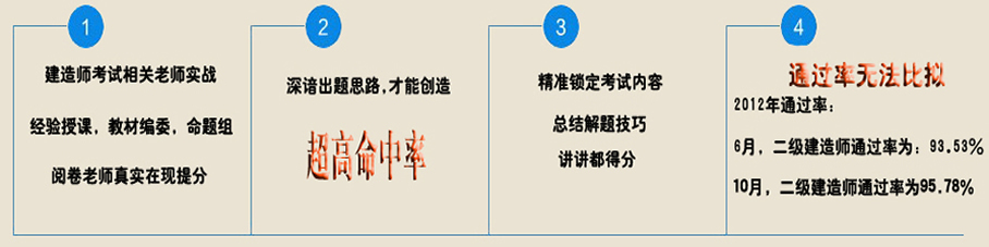 中心自称2003年从事职业资格考试考前培训工作以来,承担着注册房地产估价师、房地产经纪人、一二级建造师、物业管理师等执业资格考试的考前培训工作,以教学质量好、考试通过率高而赢得广大考生和企业认可。2012年经我中心辅导参加一二级建造师考试的考生考试均取得了较理想的成绩,考试通过率在同类培训机构中名列前茅。