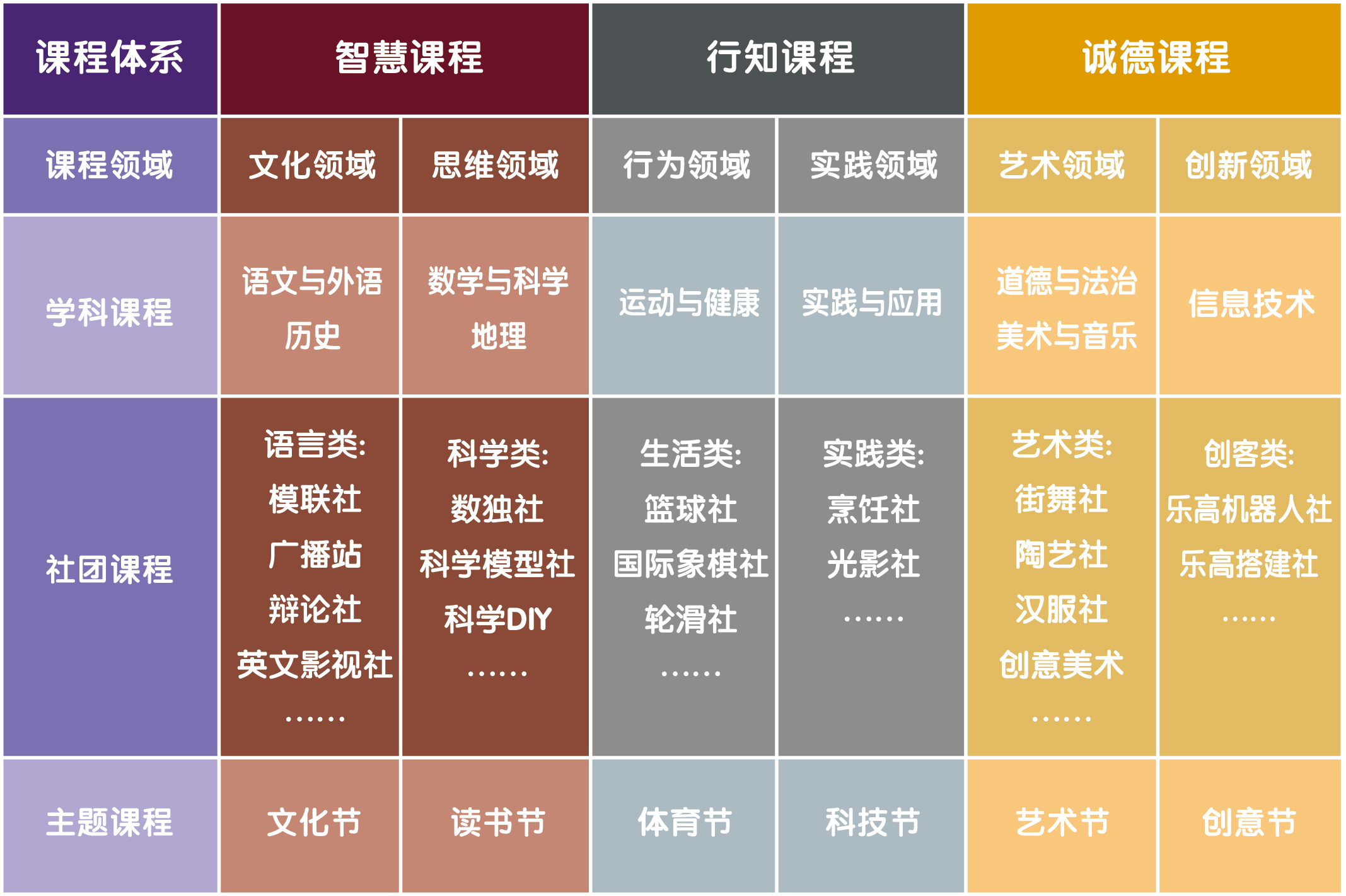 初中国内精英班以传统文化为根基,国家课程为基础,生成三大课程体系——智慧课程、行知课程和诚德课程,形成六大课程领域——文化领域、思维领域、行为领域、实践领域、艺术领域、创新领域。让学生的学习实现从知识到能力、从能力到智慧的升华。