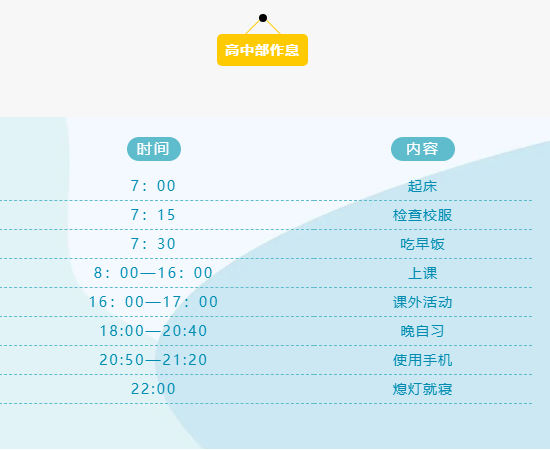 在青岛赫德高中,自律从他律开始。赫德对学生的管理颇为严格,学生开学前会收到详细的学生管理手册,其中包含对学生学术诚信、行为举止、电子设备、着装要求的严格管理条例。每天的作息安排精确到了分钟: