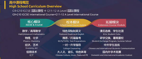 青岛赫德国际高中段课程均由核心模块(参加全球统考)、校本模块和拓展模块组成。核心模块是应对升学的硬核学科,校本模块是通过项目制学习,培养学生的软实力,拓展模块是培养团队精神、社会意识的运动竞技和社会实践类课程,让学生做好融入世界知己知彼的思想准备。三个模块设置的逻辑是为了让学生集中精力、深入细致地去学习自己擅长的几门学科;将其余宝贵的时间投入到感兴趣的项目制学习中,培养自己的软实力,做好融入世界的准备。