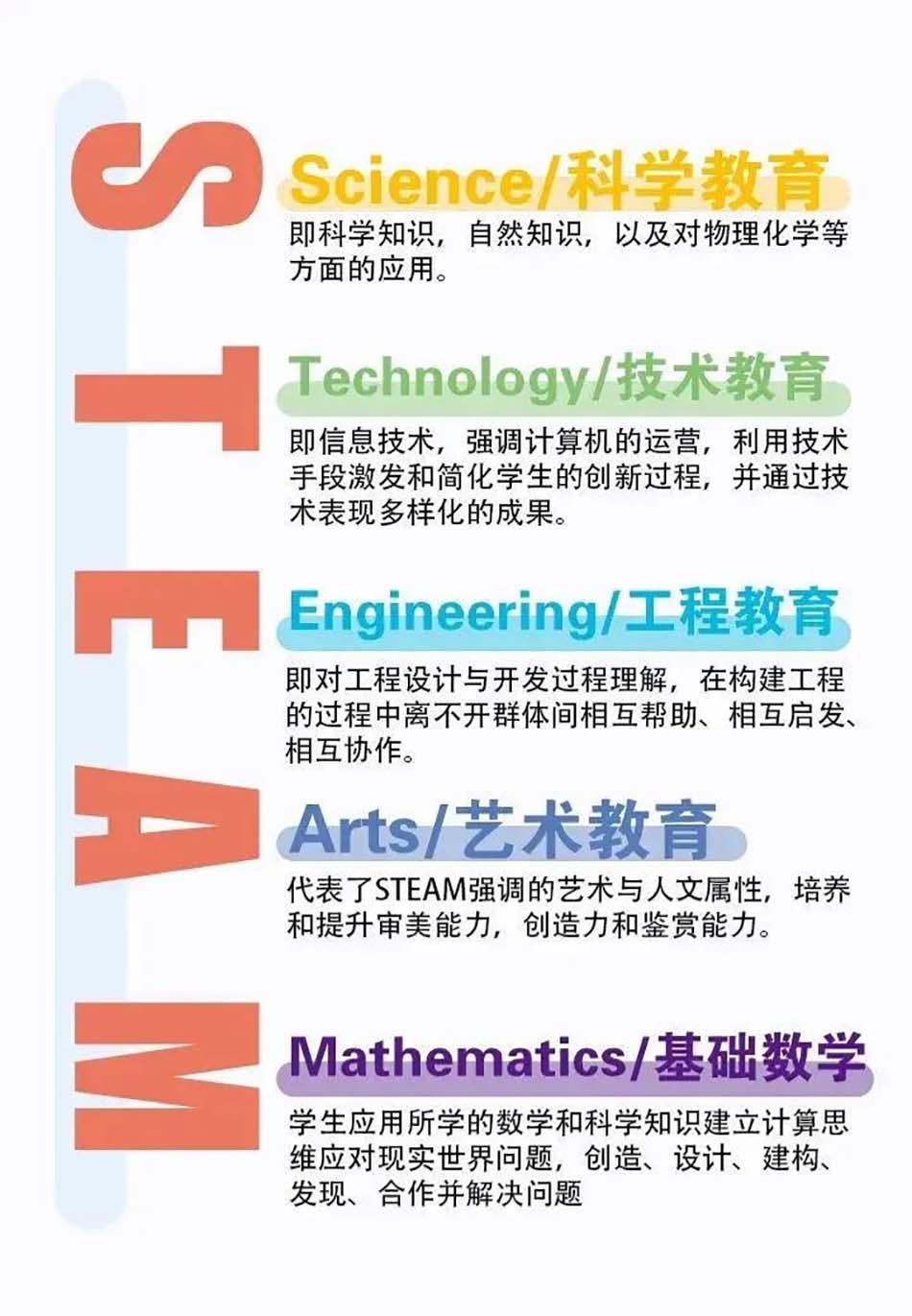 STEAM是科学(Science)、技术(Technology)、工程(Engineering)、艺术(Art)及数学(Mathematics)五个学科的首字母缩略字。为适应未来社会的发展,我们应加大学生跨学科素养和能力的培养。STEAM教育让孩子们自己动手完成他们感兴趣的并且和他们生活相关的项目,在过程中学习各种学科以及跨学科的知识。STEAM其实是基于标准化考试的传统教育理念的转型,它代表着一种现代的教育哲学,更注重学习的过程,而不仅仅是结果。STEAM教育的本质是敢于让孩子们犯错,让他们尝试不同的想法,让他们听到不同的观点。与考试相反的,我们希望孩子们创造能够应用于真实生活的知识,鼓励孩子们动手实践,从而找到自己想要的答案,达到潜能开发的目的,STEAM教育的终极目标是培养孩子的综合素养,提升孩子面对高科技未来社会的竞争力。这也正是青苗教育的培养目标。