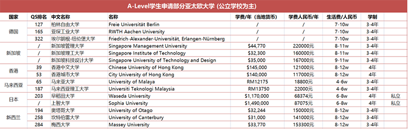 当然这其中各国留学费用各有高低,大家可根据心仪国家,心仪专业综合计算留学费用。下表为老师整理的部分亚太欧大学情况,有需要的小伙伴可做参考。
