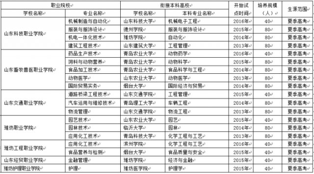 其中,驻潍 8 所" 3+2 "对口贯通分段培养试点高职高专院校参与试点,分别为:山东科技职业学院、山东畜牧兽医职业学院、山东交通职业学院、潍坊职业学院、潍坊工程职业学院、山东经贸职业学院、潍坊护理职业学院、山东信息职业技术学院共计招生 1320 人。