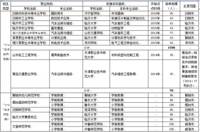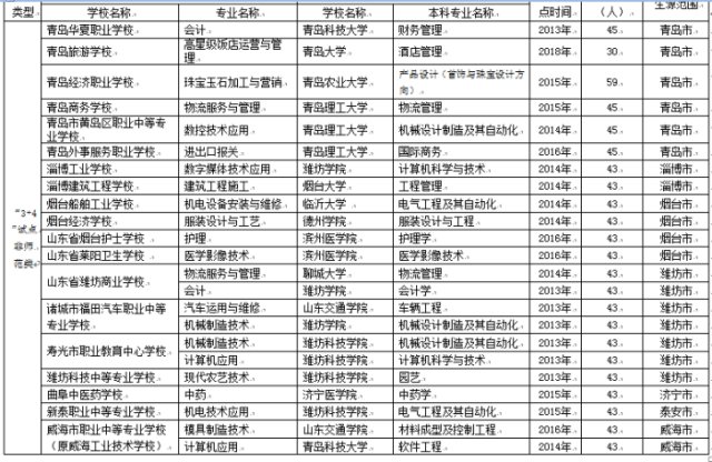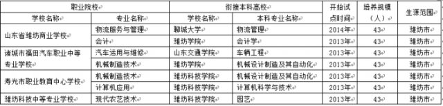 " 3+4 "对口贯通分段培养非师范类试点中职学校分别为山东省潍坊商业学校、诸城市福田汽车职业中等专业学校、寿光市职业教育中心学校、潍坊科技中等专业学校,共计招生 301 人。