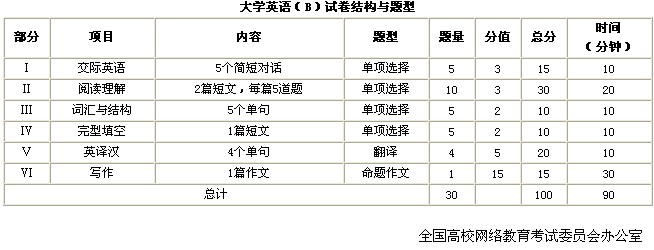 为适应在职人员英语学习的需要,2012年4月网络教育统考大学英语(A)和大学英语(B)机网考考试将在2010年修订版考试大纲的范围内对部分题型与试卷结构予以局部调整,具体情况说明如下: